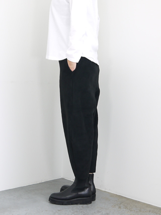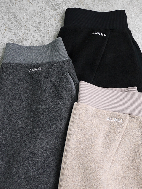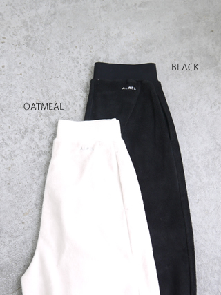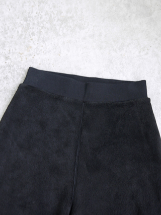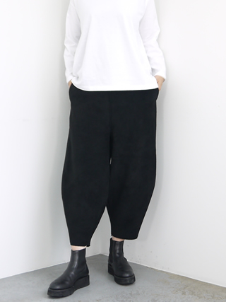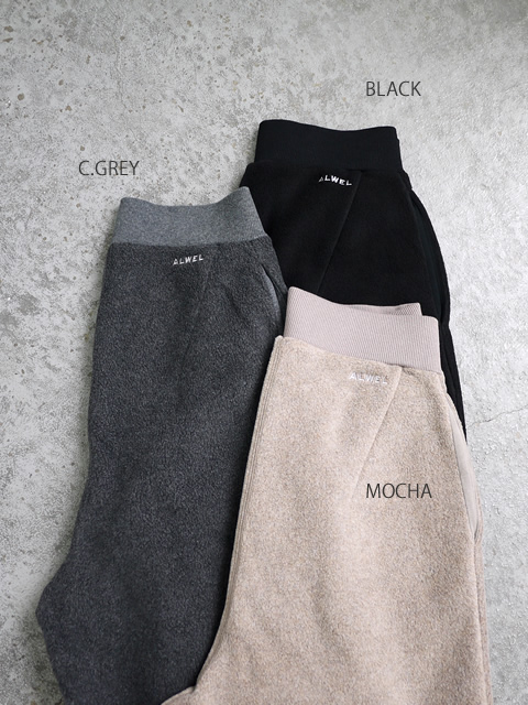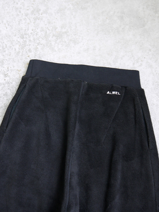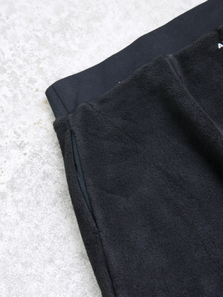 上品なフリース素材を使用したペグパンツ。軽やかな着用感でとても暖かく、大人っぽさのあるスポーツテイストに。股上を深く、ヒップ周りもゆったりとデザイン。ウエスト部分はリブ仕様のゴム入り、ヒップ部分のダーツによる膨らみでストレスのない着心地になっています。サイドにシームポケット付き。バッグにはロゴ刺繍があり、さりげないアクセントがポイントです。