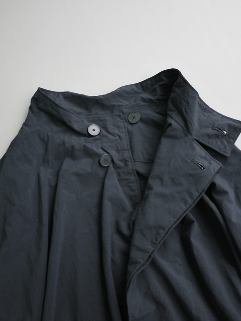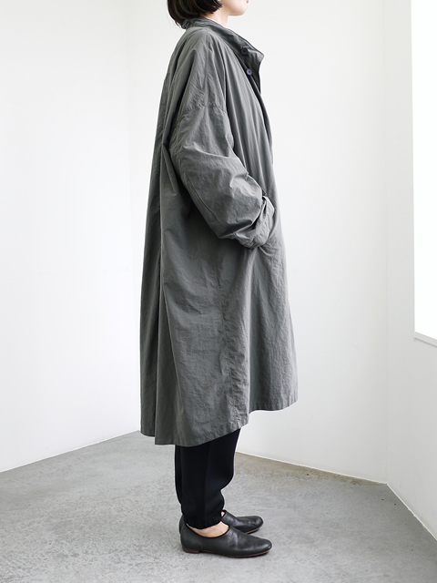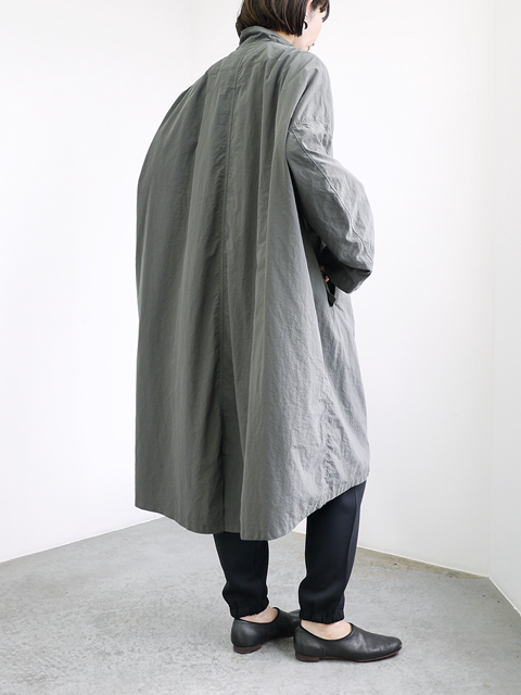 フィルマムで定番となっているオーバーサイズのスタンドカラーコート。デザインは肩周りや身幅、袖幅に大きくゆとりを持たせたゆったりとしたシルエットです。ウエストに配したドローコードを絞る事でシルエットをアレンジ可能。背面の裾にはフィッシュテールデザインになっています。