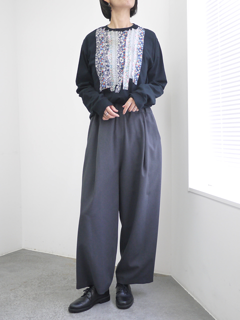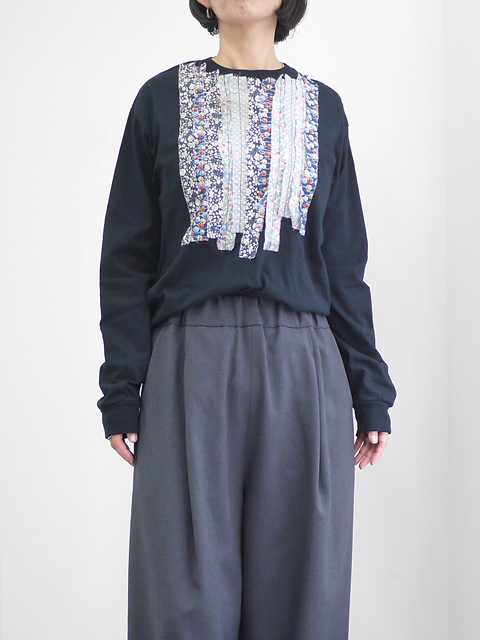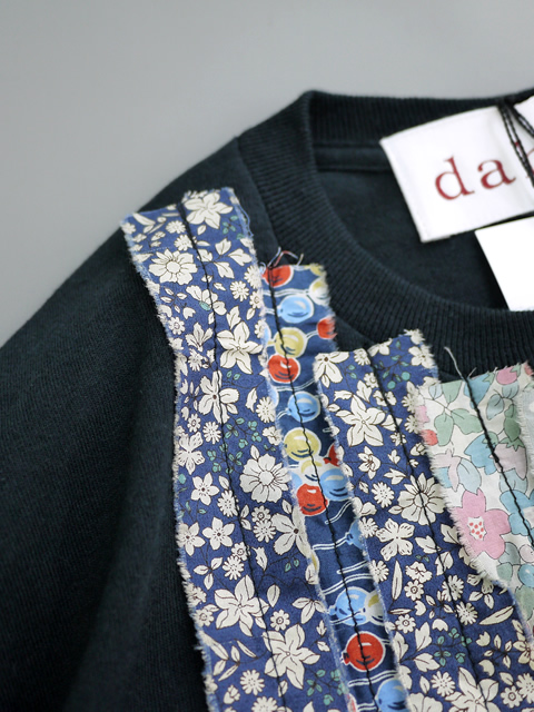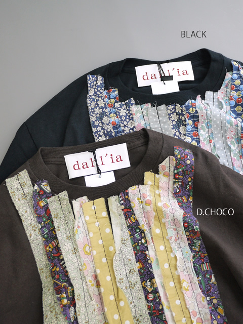 ヴィンテージの生地をフリル調にあしらったロングスリーブのリメイクカットソー。様々なテキスタイルとカラーリングのフリルが散りばめられています。ダリアならではの存在感のあるフリルデザインは、一枚で着るだけで十分に雰囲気の出るアイテムです。カジュアルなカットソーとガーリーなフリルの組み合わせがダリアらしさを演出します。