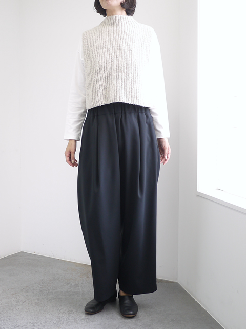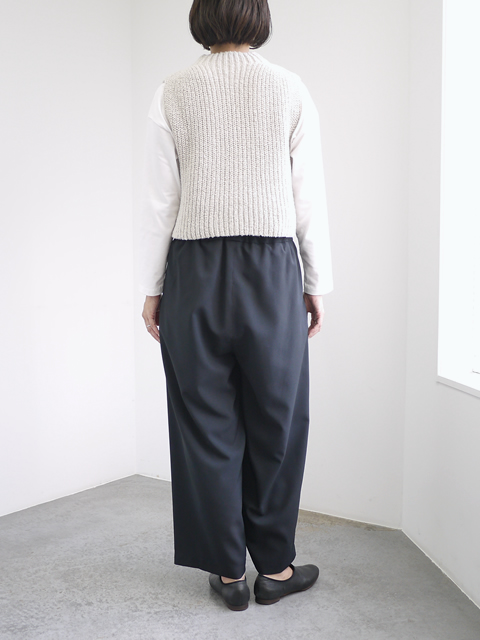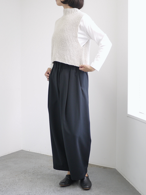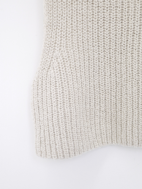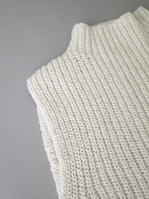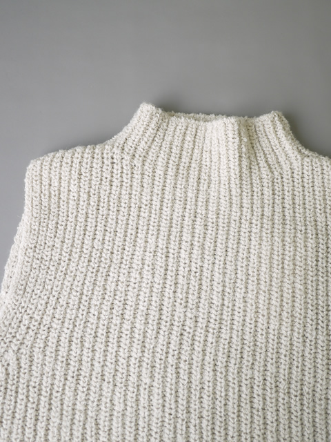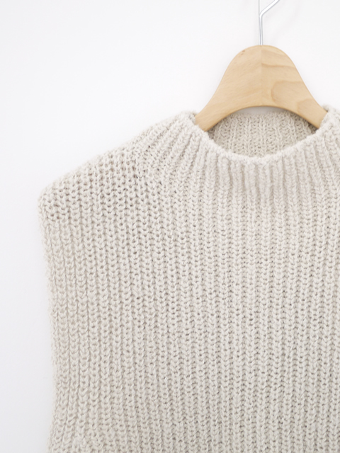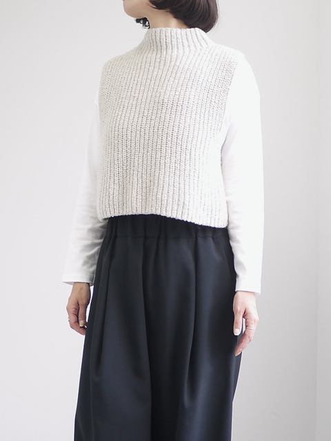 立ち上がったネックラインがアクセントのニットベストは、シャツやワンピースなどさまざまな着合わせをお楽しみいただけます。