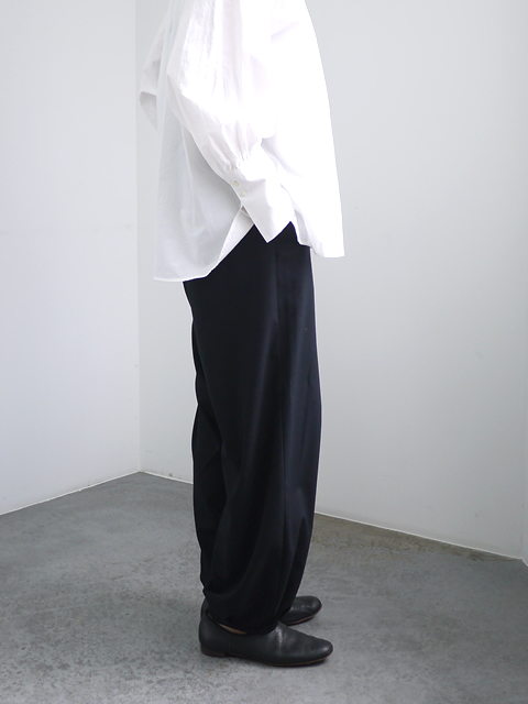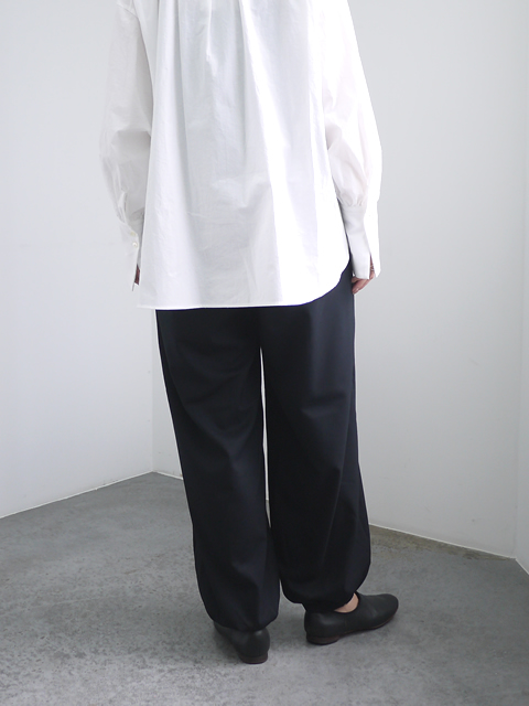 素材はウールライクな合繊生地を使用しており、落ち感のある生地がゆったりとしたシルエットを引き立てます。