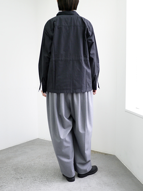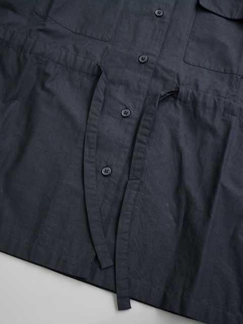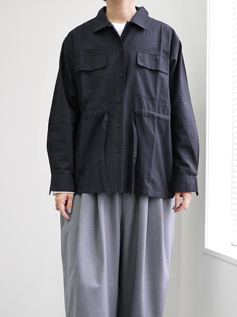 デザインは、シャツでありながらアウター感覚で羽織れるミリタリージャケットのようなデザインを採用。ウエストにはドローコードが付いており、絞ることでメリハリのあるシルエットに調整可能です。両サイドの大きめなフラップポケットがさりげないアクセントとなり、ワークウェアのような本格的な雰囲気を演出。ライトアウターとしても活躍する、着回し力の高い一着です。