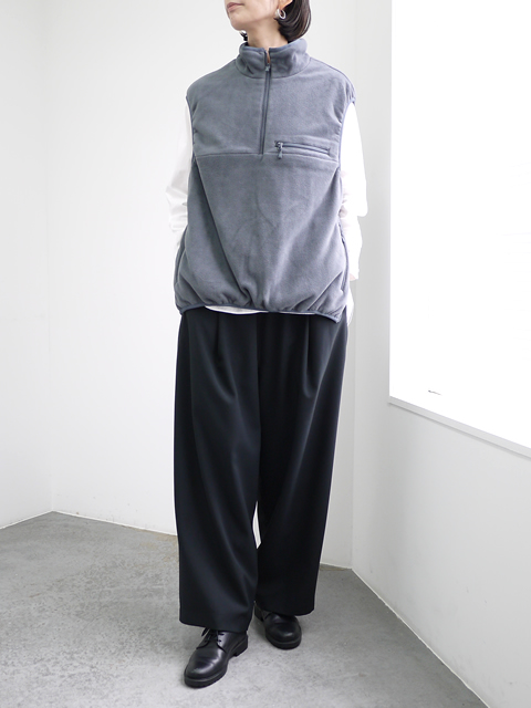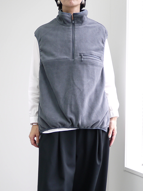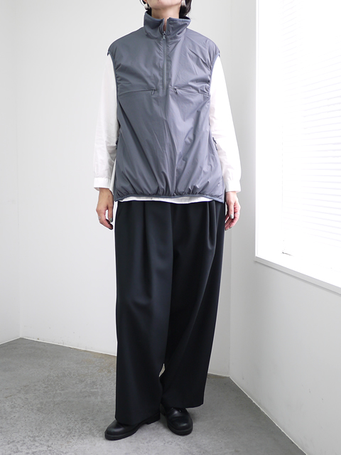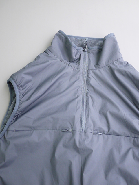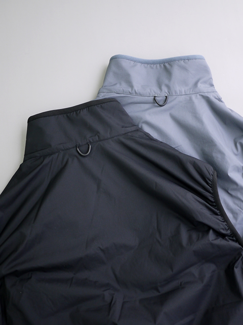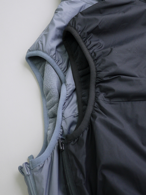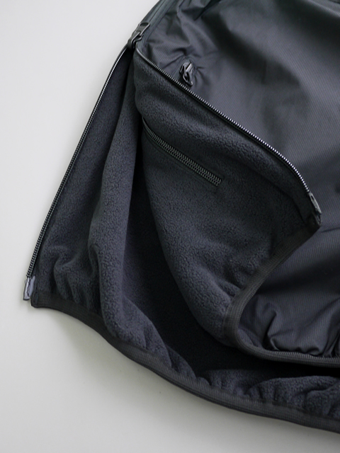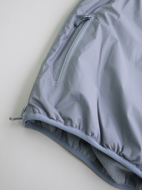 機能的なディテールも充実。表側にはジップ付きポケットを配置し、裏側にも左右にポケットを装備しています。さらに、両脇のベンチレーションジッパーは、全開にすることで脇が完全に開き、プルオーバーのデメリットであった着脱のしづらさを解消。腕を通さずに羽織ることもできる、画期的なデザインです。
