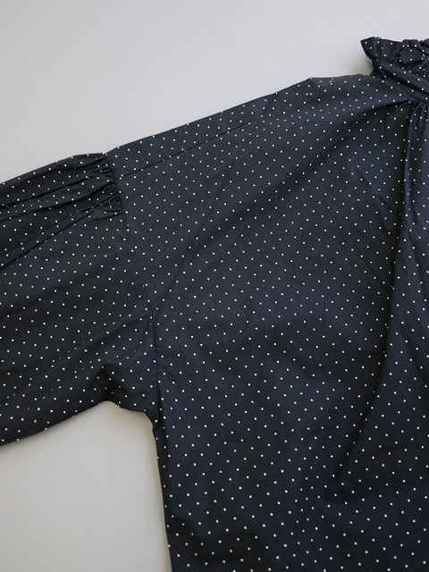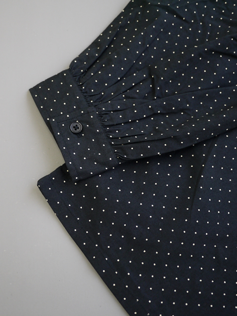 素材には40番手の中細糸で織り上げたポプリン素材を使用。程よいハリ感と光沢があり、緻密に織られた100%コットン生地は、透け感がなくしっかりとした仕上がりが魅力です。ポップになりがちなドット柄を、コントラストを抑えた配色にすることで、大人の女性も取り入れやすい上品な印象に仕上げています。