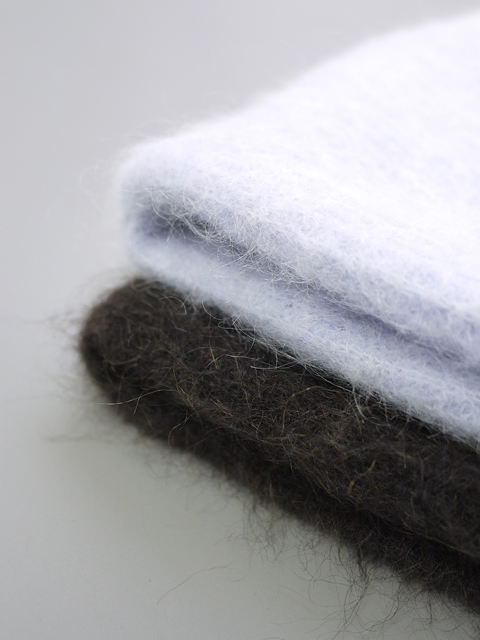 素材には、アンフィル定番のストレッチモヘアニットを使用。イタリアのファンシーヤーンメーカー「lineapiu(リネアピウ)」社の糸は、芯にポリウレタンが入っているのが特徴です。編み立てた後に目がギュッと詰まることで、風を通しにくく、高い保温性を実現します。