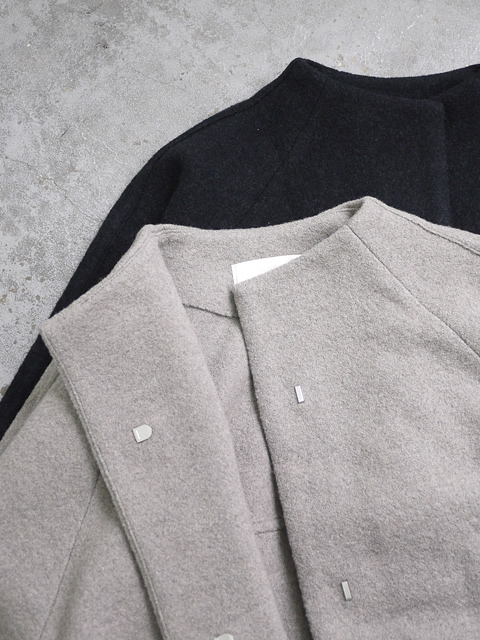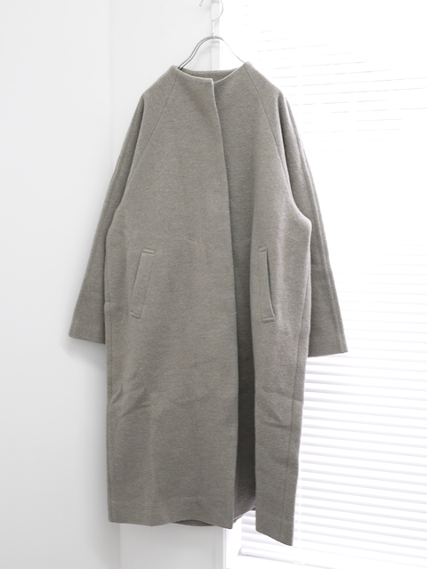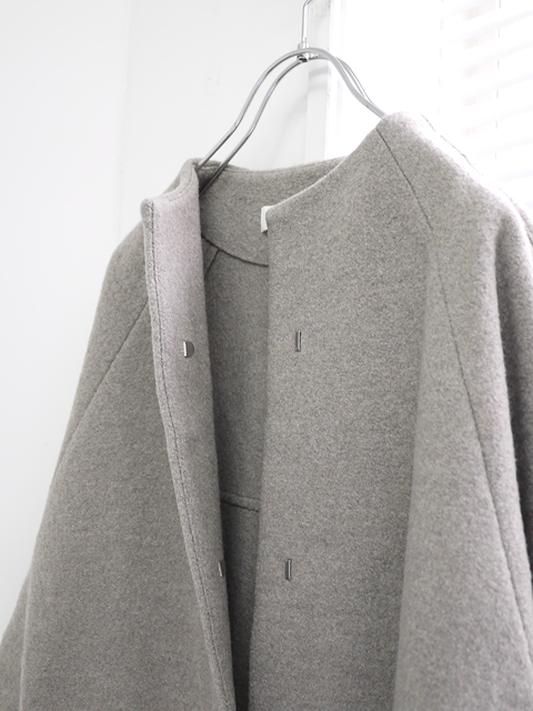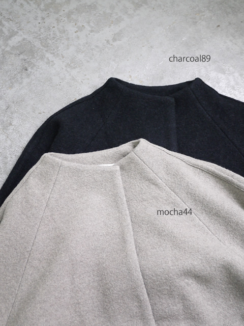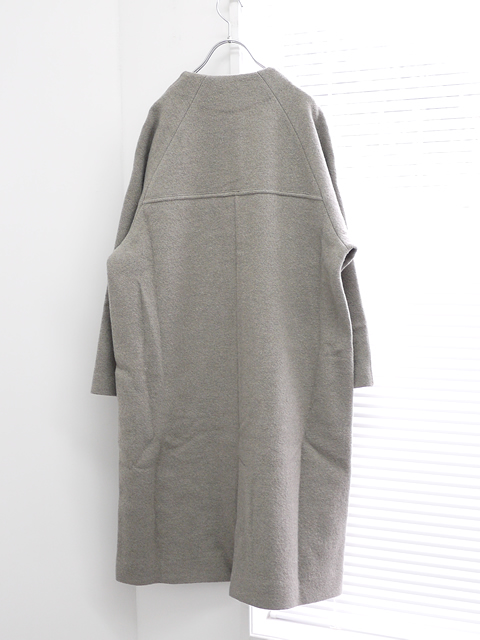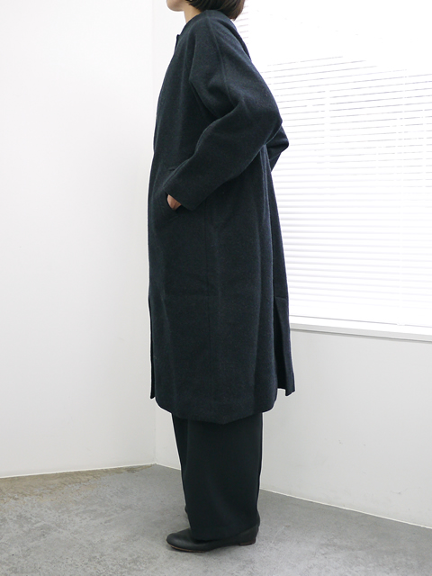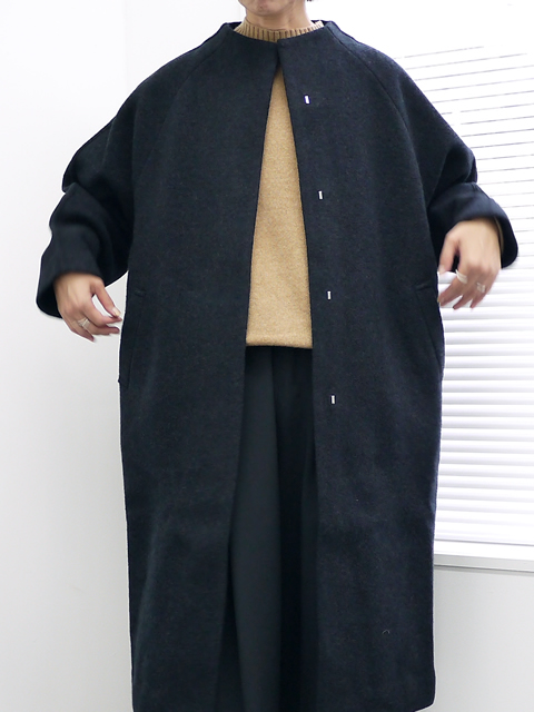 少し立ち上がったネックラインとゆったりと長めの着丈が、上品な雰囲気を演出。素材本来の風合いと暖かさを最大限に感じていただくため、裏地のない仕様になっています。インナーにニットなどを重ねることで、真冬にも十分な暖かさで着ていただける、シンプルで上質な一着です。