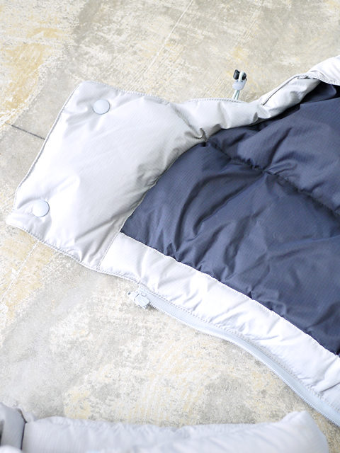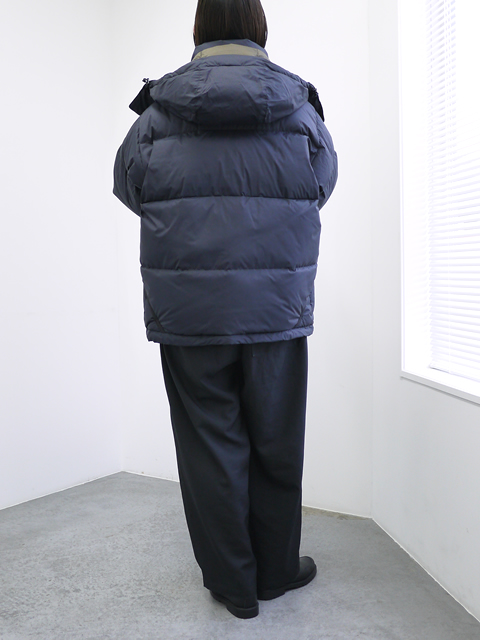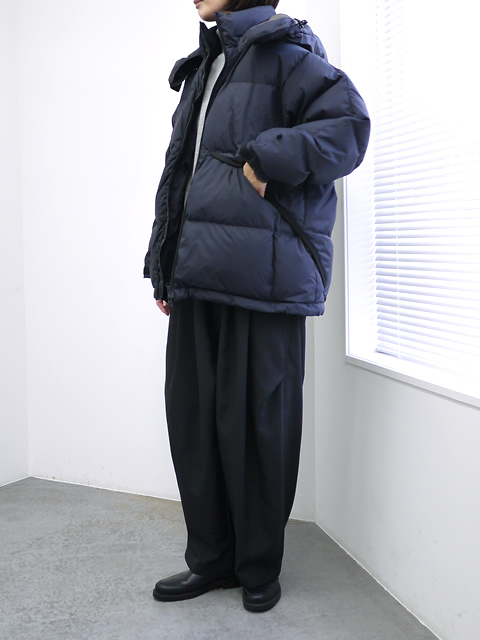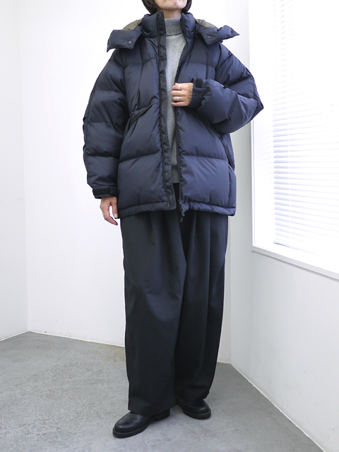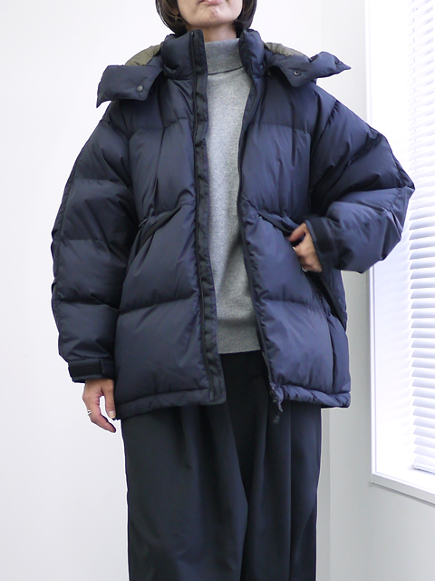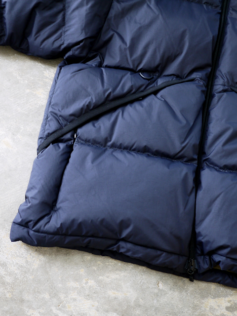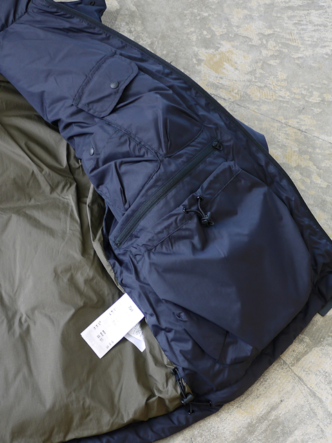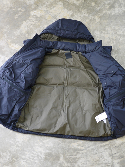 寝袋のような膨らみが特徴的なこのダウンジャケットは、シンプルな横ステッチのベーシックデザインながら、ハンティングジャケットから着想を得たフロントからサイドにかけての大きなフラップポケットが最大の特徴。このフラップポケットの中には仕切られた2つのポケットが配されています。
