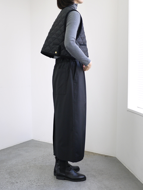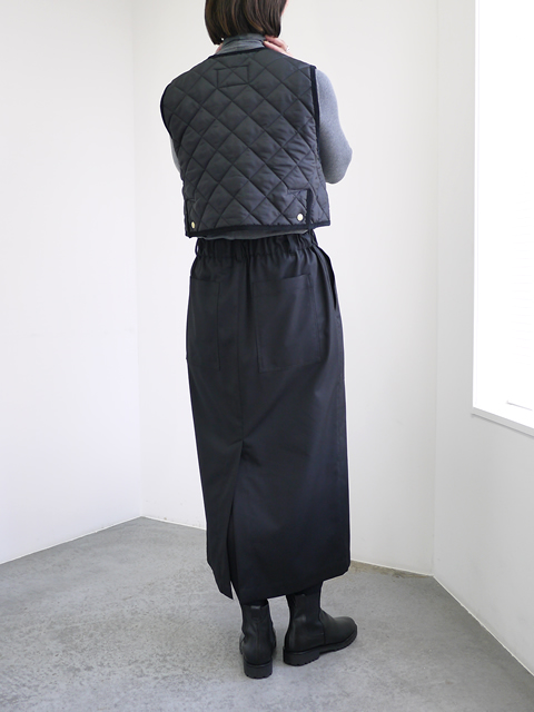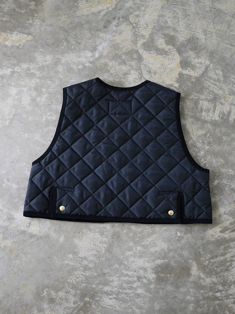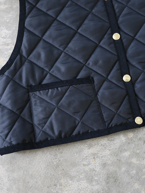 ベストセラーのノーカラーキルティングジャケット、ARKLEY(アークリー)のジレモデル。繊細なコーデュロイのパイピングや、暖かみのあるゴールドのドットボタンなどのディテールが光るデザイン。コンパクトなフォルムでレイヤードがしやすく、コーディネートの洗練されたアクセントとして活躍します。