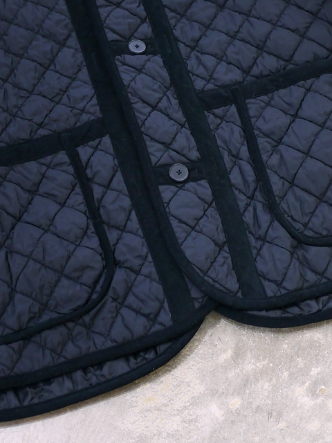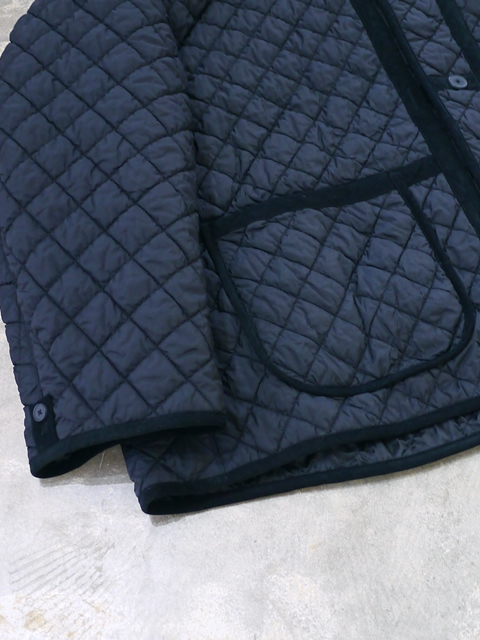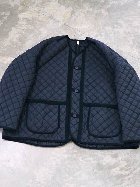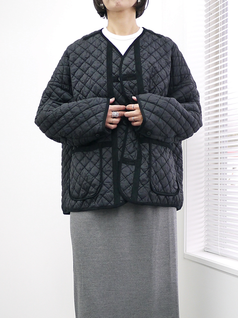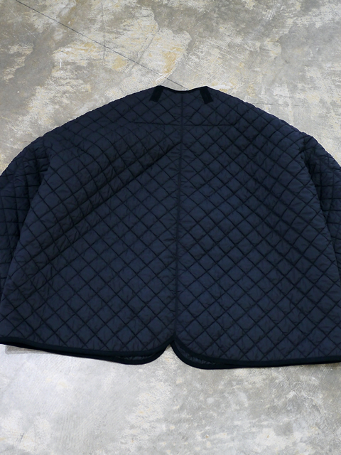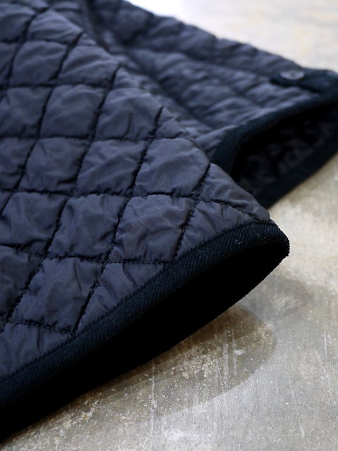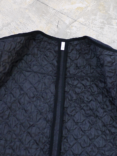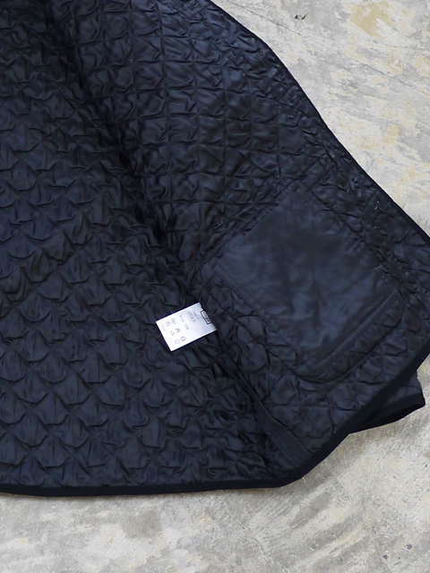 表地に超軽量ナイロンタフタ生地、中綿に保温性に優れたコアブリッド、裏地にポリエステル裏地を使用したキルティングブルゾンです。熱をかけるとシュリンク(縮む)するシートを内側に挟み込み、キルティング後に熱入れ加工を施すことで、大きく膨らみを出しており、これが視覚的な特徴となっています。この工夫により、厚みの割にはとても軽量で着やすい点が大きなポイントです。