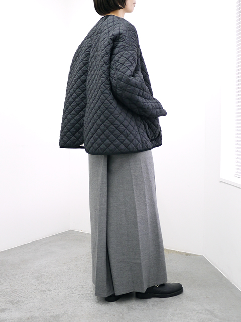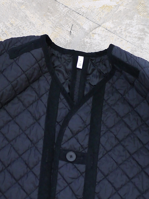 デザインは、コーデュロイのパイピングとテーピングをポイントにした洗練された印象。襟元はコンパクトなノーカラーVネックのため、タートルネックやストールとの相性が抜群です。