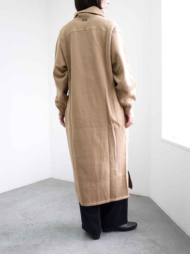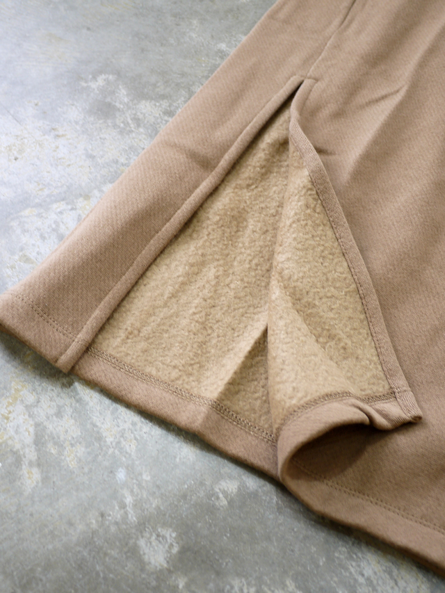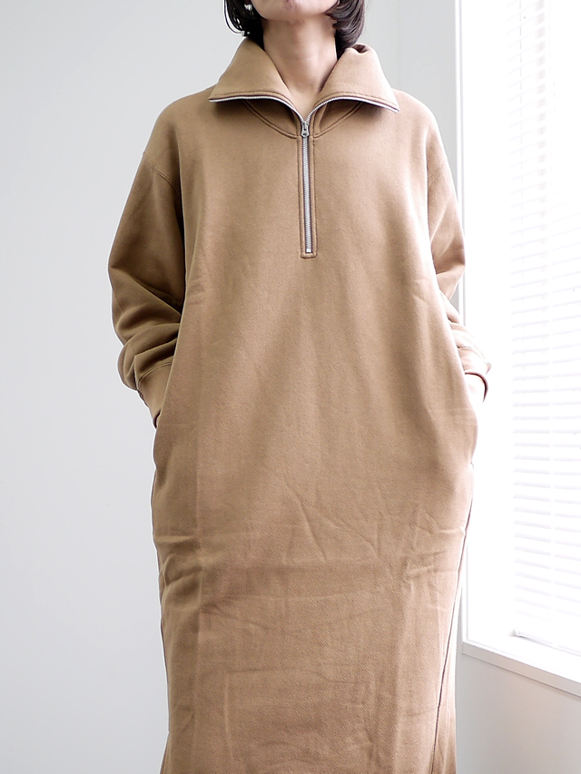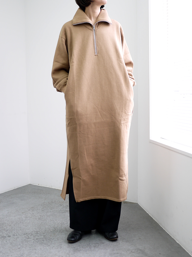 裏地にふんわりとした裏起毛を施した、暖かな着心地のスウェットワンピースです。首元はスポーティなハーフジップデザイン。シルエットに軽やかな抜け感をプラスするため、右裾にのみスリットが施されています。リラックス感がありながらも、一枚でサマになるアイテムです。